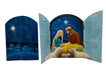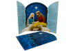 Kuvassa kirkas jouluntähti valaisee pyhää perhettä ja Jeesus-lasta. Myös lempeäkatseiset lampaat ihastelevat vastasyntynyttä vapahtajaa. Kuvaa kehystää jouluevankeliumin koskettava teksti.